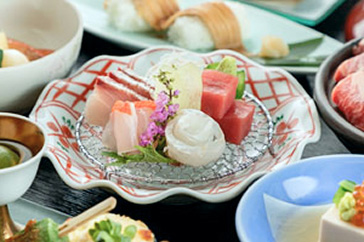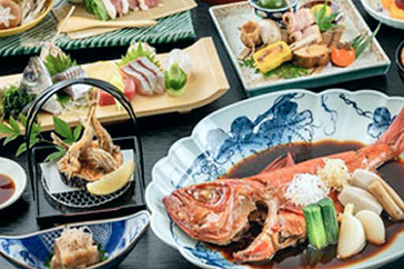 地元伊豆を中心に、その時々で最高の食材を最高の状態でお召し上がりいただきます。新鮮な魚介の旨みを生かした海の幸ずくしの会席。彩り豊かな旬の味わいをお楽しみください。