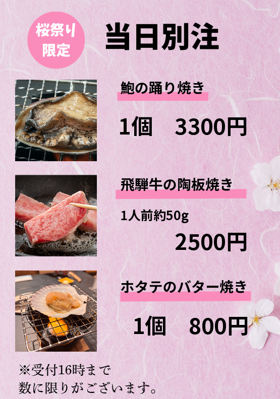 お花見でお腹が空いた後は、とろけるような贅沢を。 日頃の感謝を込めまして、期間限定で飛騨牛の特別キャンペーンを実施いたします!