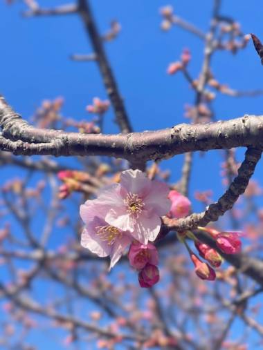 ◆河津桜原木(田中地区):現在*2分咲き」まで進んでおります!町内で最も早く、力強く咲き出す初桜のエネルギーを今すぐ感じていただけます。